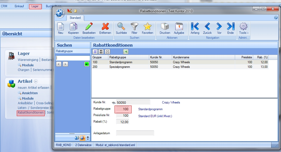 Rabattgruppen müssen Sie im Modul "Rabattkonditionen" (Reiter "Lager", s. Screenshot) vornehmen.