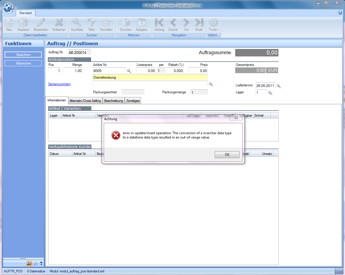 Beim Anlegen einer Position in einem neuen Auftrag kommt folgende Fehlermeldung: (siehe anhang)