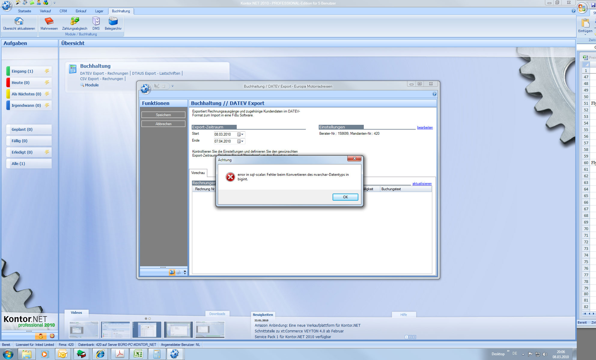 Beim Versuch das Startdatum im Datev Export zu verändern erscheint die Fehlermeldung: