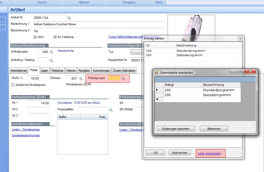 Sie können die Liste der Rabattgruppen direkt bei der Auswahl der Gruppe im Artikel bearbeiten (s. Screenshot).